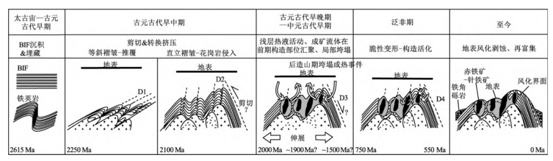 新元古代,受泛非運動影響,發(fā)生構(gòu)造活化和脆性形變,在構(gòu)造邊界處形成針狀赤鐵礦。在此 之后,該地區(qū)發(fā)生區(qū)域性構(gòu)造隆升,在地表風(fēng)化作用下,發(fā)生硅的流失,并形成大量針鐵礦,含鐵建造 進(jìn)一步富集成礦。