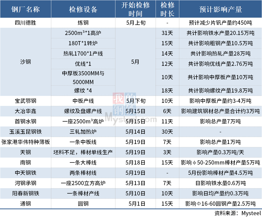 據(jù)Mysteel不完全統(tǒng)計(jì),截至5月20日,國(guó)內(nèi)13家鋼廠發(fā)布檢修計(jì)劃。其中,中天鋼鐵因一座轉(zhuǎn)爐檢修,坯料不足,兩條棒材線停產(chǎn)檢修,預(yù)計(jì)5月份影響棒材產(chǎn)量4.5萬噸;南鋼于5月18日起對(duì)一條大棒線進(jìn)行檢修,為期半個(gè)月,預(yù)計(jì)影響φ50-250mm棒材產(chǎn)量5萬噸。