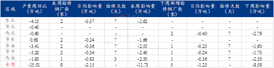 本周(5月12日-18日)Mysteel調(diào)研螺紋鋼調(diào)研樣本中共有9家鋼廠存在螺紋產(chǎn)線檢修,共影響產(chǎn)量11.73萬噸。其中東北華東華南、華中各7家,分別影響產(chǎn)量2.62、1.66、2.55、2.4萬噸;西南1家,影響產(chǎn)量2.5萬噸。