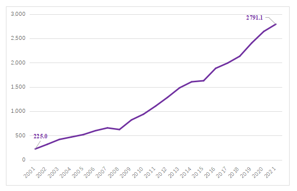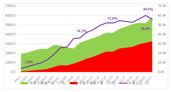 2021年在全國鋼鐵產(chǎn)能產(chǎn)量雙控的形勢下,我國不銹鋼產(chǎn)量仍實現(xiàn)了5.1%的增長,達到3263.3萬噸,占世界不銹鋼產(chǎn)量的56.0%。相比2001年,我國不銹鋼粗鋼產(chǎn)量增長近43.7倍,年均增長率達到20.9%,不銹鋼表觀消費量增長11.4倍,年均增長率達到13.4%。我國已成為全球不銹鋼生產(chǎn)和消費大國,正走向不銹鋼產(chǎn)業(yè)發(fā)展的強國,未來必將長期引領全球不銹鋼產(chǎn)業(yè)邁入中國時代。