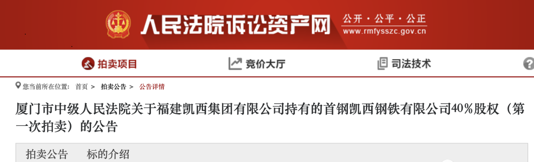 一、拍賣標(biāo)的:福建凱西集團(tuán)有限公司持有的首鋼凱西鋼鐵有限公司40%股權(quán)