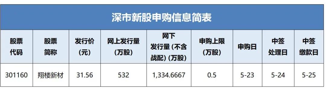 5月23日,蘇州翔樓新材料股份有限公司(以下簡(jiǎn)稱“翔樓新材”或“公司”)將正式開啟申購。公司此次公開發(fā)行股票數(shù)量為18,666,667股,其中網(wǎng)上初始發(fā)行數(shù)量為5,320,000股,股票代碼“301160”,申購代碼“301160”,發(fā)行價(jià)格31.56元/股。