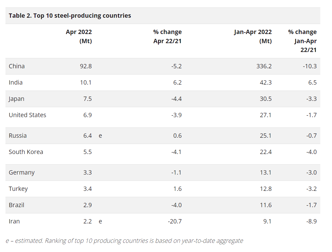 據(jù)世界鋼鐵協(xié)會發(fā)布的數(shù)據(jù),2022年4月全球粗鋼產(chǎn)量同比下降5.1%至1.627億噸。中國4月的粗鋼產(chǎn)量為9280萬噸,同比下降了5.2%;印度4月產(chǎn)量為1010萬噸,同比增長6.2%;日本4月產(chǎn)量為750萬噸,同比下降了4.4%;美國4月產(chǎn)量為690萬噸,同比下降3.9%。