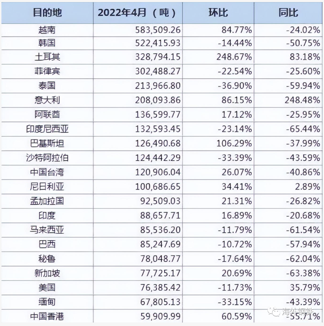 4月份進口我國鋼鐵前五的的國家是,越南第一,58.35萬噸,環(huán)比(比上月)增長84.77%,同比下降24.02%。韓國第二,52.24萬噸,環(huán)比下降14.44%,同比下降50.75%。土耳其第三,32.87萬噸,環(huán)比上漲248.67%,同比增長83.18%。菲律賓第四,30.24萬噸,環(huán)比下降22.54%,同比增長25.6%。泰國第五,21.39萬噸,環(huán)比下降36.90%,同比下降59.94%。