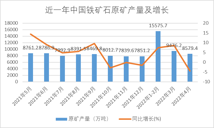 據國家統計局數據顯示,2022年4月份,我國鐵礦石原礦產量8579.4萬噸,比上月減少了896.8萬噸,環(huán)比下降9.5%,同比下降4.5%;2022年1-4月累計鐵礦石產量33079.4萬噸,同比下降0.9%。
