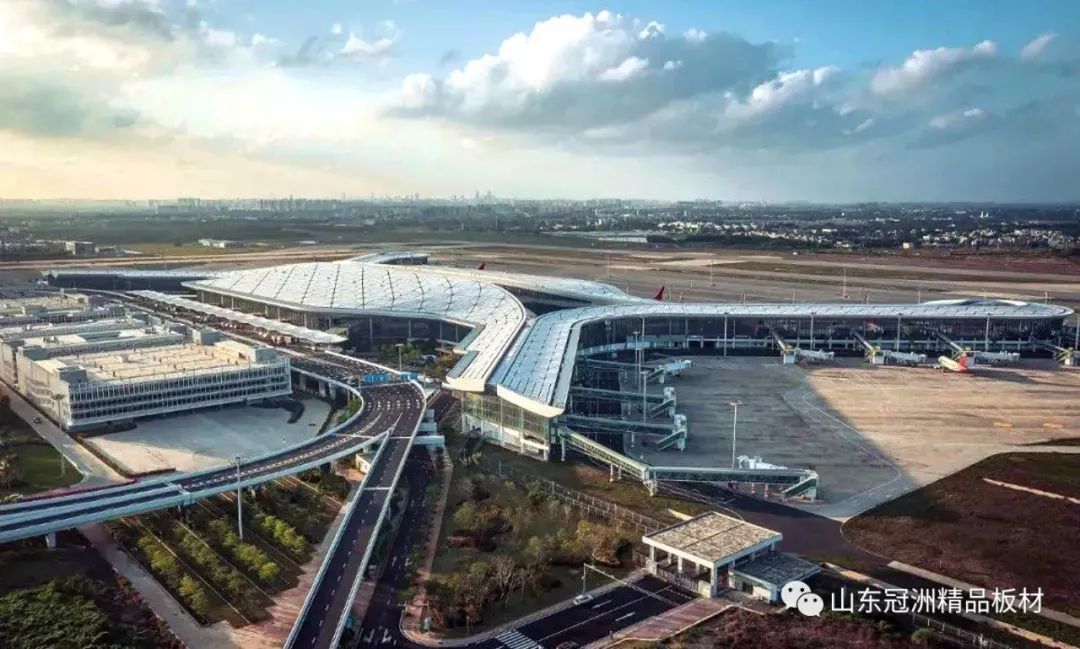 機(jī)場航站樓圍護(hù)系統(tǒng)選用冠洲氟碳彩涂板。