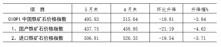 據(jù)中國鋼鐵工業(yè)協(xié)會(huì)監(jiān)測,5月末,中國鐵礦石價(jià)格指數(shù)(CIOPI)為495.83點(diǎn),環(huán)比下降19.81點(diǎn),降幅為3.84%;降幅較上月收窄4.81個(gè)百分點(diǎn)。(見下圖)