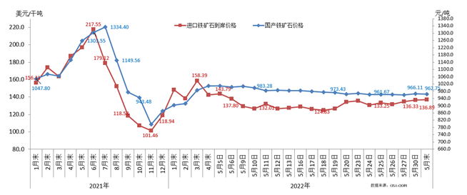 5月末,CIOPI國產(chǎn)鐵精礦價(jià)格為962.75元/噸,環(huán)比下降46.61元/噸,降幅為4.62%,環(huán)比由升轉(zhuǎn)降;CIOPI進(jìn)口粉礦到岸價(jià)格為136.89美元/噸,環(huán)比下降5.28美元/噸,降幅為3.71%。(見下圖)