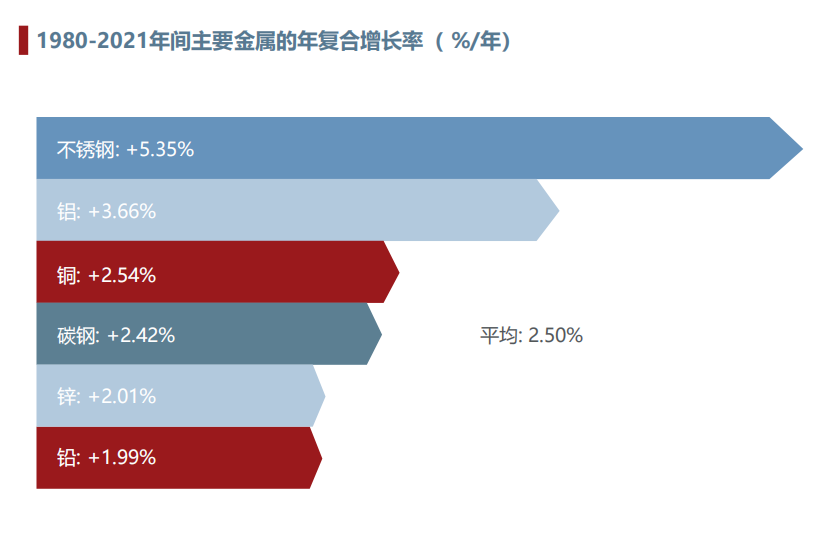 1980年至2021年間主要金屬的年平均復(fù)合增長率為2.5%