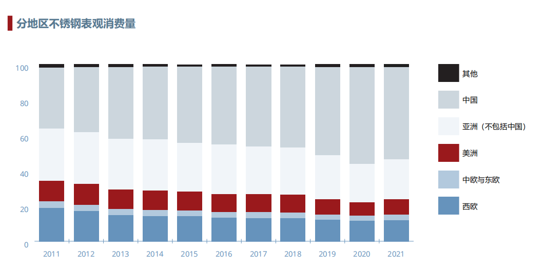 2005年,各地區(qū)不銹鋼占比分別為:中國12.9%、亞洲(不包括中國和韓國)29.7%、美國9.2%、歐洲34.8%、其他(巴西、俄羅斯、南非、韓國、印度尼西亞)13.5%。2021年,各地區(qū)不銹鋼占比分別為:中國56%、亞洲(不包括中國和韓國)13.4%、美國4.1%、歐洲12.3%、其他(巴西、俄羅斯、南非、韓國、印度尼西亞)14.3%。