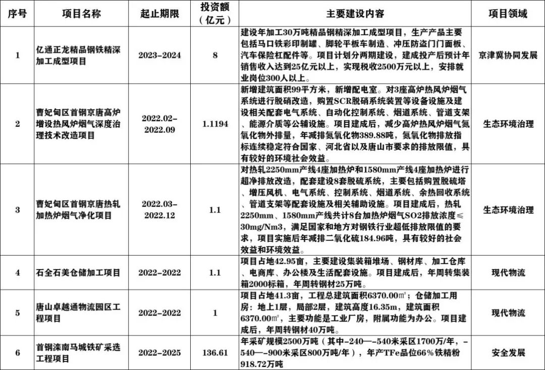 此外,從《通知》中獲悉,首都經(jīng)濟(jì)圈重要支點(diǎn)建設(shè)“十四五”重點(diǎn)項(xiàng)目清單也予以公布,其中涉及到京津冀協(xié)同發(fā)展、新型城鎮(zhèn)化、社會(huì)治理、安全發(fā)展、文旅體育、基礎(chǔ)設(shè)施、民生、現(xiàn)代物流、生態(tài)環(huán)境治理等9個(gè)項(xiàng)目領(lǐng)域的130個(gè)重點(diǎn)項(xiàng)目。其中涉及到鋼鐵行業(yè)相關(guān)的6個(gè),詳情如下: