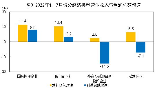 1 — 7 月份,規(guī)模以上工業(yè)企業(yè)中,國有控股企業(yè)實(shí)現(xiàn)利潤總額 17370.6 億元,同比增長 8.0% ;股份制企業(yè)實(shí)現(xiàn)利潤總額 36347.3 億元,增長 3.2% ;外商及港澳臺商投資企業(yè)實(shí)現(xiàn)利潤總額 10935.3 億元,下降 14.5% ;私營企業(yè)實(shí)現(xiàn)利潤總額 13116.5 億元,下降 7.1% 。