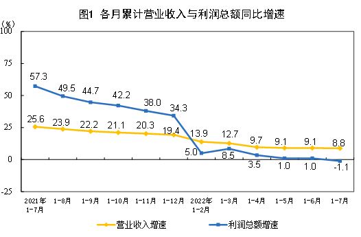 1 — 7 月份,采礦業(yè)實(shí)現(xiàn)利潤總額 9961.1 億元,同比增長 1.05 倍;制造業(yè)實(shí)現(xiàn)利潤總額 36217.2 億元,下降 12.6% ;電力、熱力、燃?xì)饧八a(chǎn)和供應(yīng)業(yè)實(shí)現(xiàn)利潤總額 2751.2 億元,下降 12.5% 。