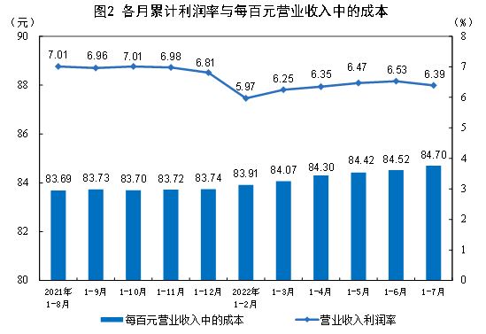 1 — 7 月份,規(guī)模以上工業(yè)企業(yè)每百元營業(yè)收入中的成本為 84.70 元,同比增加 0.95 元;每百元營業(yè)收入中的費(fèi)用為 7.93 元,同比減少 0.50 元。