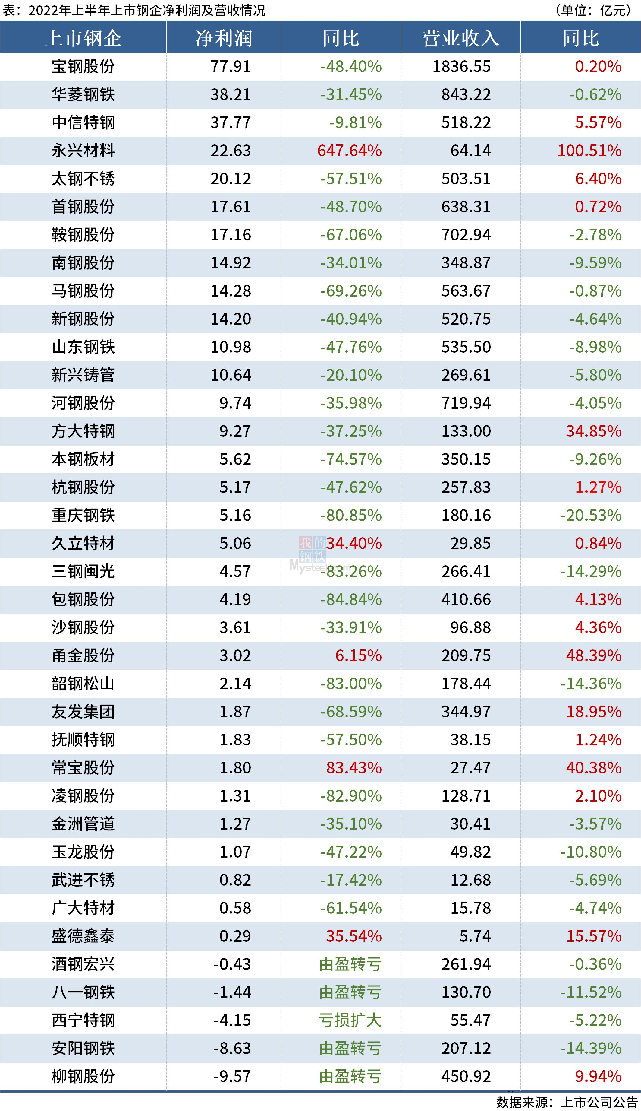 據(jù)Mysteel統(tǒng)計,截至8月30日,有37家上市鋼企發(fā)布上半年業(yè)績報告,合計實現(xiàn)營業(yè)收入11938.24億元,凈利潤340.6億元。