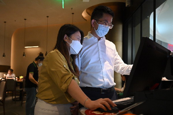 郵儲(chǔ)銀行工作人員(右)在湯城小廚查看企業(yè)經(jīng)營(yíng)情況。記者 潘悅 攝