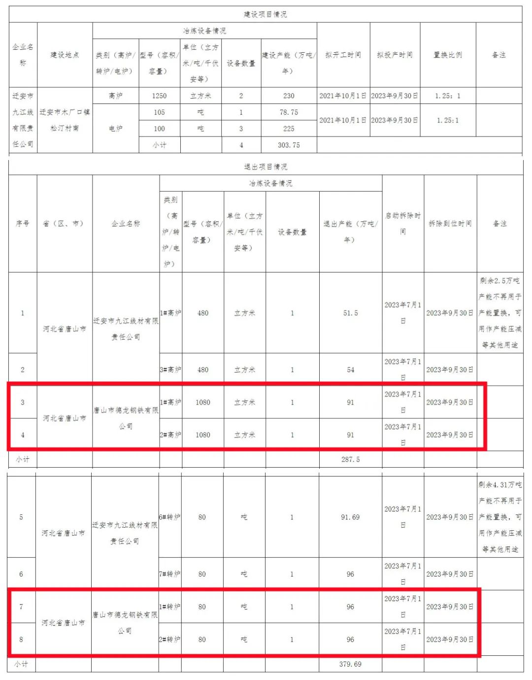 據(jù)河北省工業(yè)和信息化廳公布的《遷安市九江線材有限責(zé)任公司整合重組減量置換項目產(chǎn)能置換方案公告》顯示,相關(guān)項目的擬開工時間為2021年10月1日,擬投產(chǎn)時間為2023年9月30日。而與之相對應(yīng)的,唐山德龍的相關(guān)高爐、轉(zhuǎn)爐的啟動拆除時間為2023年7月1日,拆除到位時間為2023年9月30日。