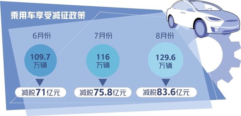 統(tǒng)計(jì)顯示,6月份,109.7萬(wàn)輛乘用車享受減征政策,減稅71億元;7月份116萬(wàn)輛,減稅75.8億元;8月份129.6萬(wàn)輛,減稅83.6億元。3個(gè)月以來(lái),享受政策的車輛數(shù)、減征稅額均呈現(xiàn)逐月增長(zhǎng)態(tài)勢(shì),顯示出減征政策逐步發(fā)力、受益面穩(wěn)步擴(kuò)大。特別是8月份減稅額和享受優(yōu)惠的車輛環(huán)比增幅均超10%,分別為10.3%、11.7%。