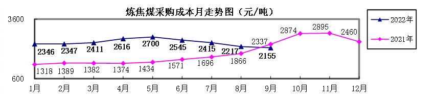 對(duì)標(biāo)企業(yè)煉焦煤9月份加權(quán)平均折算成干基的采購(gòu)成本為2154.82元/噸,環(huán)比下降62.41元/噸,降幅為2.81%。1-9月累計(jì)平均折算成干基的采購(gòu)成本為2414.10元/噸,同比升高816.22元/噸,升幅為51.08%。