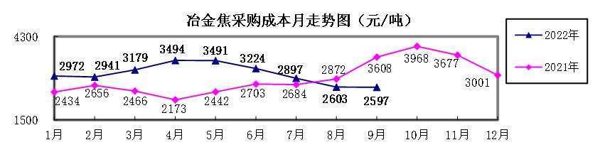 冶金焦9月份加權(quán)平均折算成干基的采購(gòu)成本2596.84元/噸,環(huán)比下降6.51元/噸,降幅為0.25%。1-9月累計(jì)平均折算成干基的采購(gòu)成本為3038.26元/噸,同比升高372.54元/噸,升幅為13.98%。