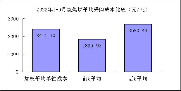 1-9月對(duì)標(biāo)企業(yè)煉焦煤平均采購(gòu)成本最低的前5家企業(yè)折算成干基的加權(quán)平均采購(gòu)成本為1839.98元/噸,比對(duì)標(biāo)企業(yè)平均采購(gòu)成本低574.13元/噸,低于平均采購(gòu)成本23.78%;而采購(gòu)成本最高的5家企業(yè)的加權(quán)平均采購(gòu)成本為2690.44元/噸,比對(duì)標(biāo)企業(yè)平均采購(gòu)成本高276.34元/噸,高于平均采購(gòu)成本11.45%。