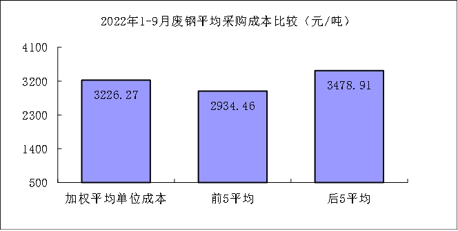 1-9月對(duì)標(biāo)企業(yè)廢鋼平均采購(gòu)成本最低的前5家企業(yè)的加權(quán)平均采購(gòu)成本為2934.46元/噸,比對(duì)標(biāo)企業(yè)平均采購(gòu)成本低291.81元/噸,低于平均采購(gòu)成本9.04%;而采購(gòu)成本最高的5家企業(yè)加權(quán)平均采購(gòu)成本為3478.91元/噸,比對(duì)標(biāo)企業(yè)平均采購(gòu)成本高252.64元/噸,高于平均采購(gòu)成本7.83%。