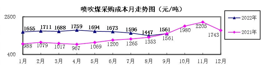 1-9月對(duì)標(biāo)企業(yè)噴吹煤平均采購(gòu)成本最低的前5家企業(yè)折算成干基的加權(quán)平均采購(gòu)成本為1196.55元/噸,比對(duì)標(biāo)企業(yè)平均采購(gòu)成本低431.56元/噸,低于平均采購(gòu)成本26.51%;而采購(gòu)成本最高的5家企業(yè)的加權(quán)平均采購(gòu)成本為2014.23元/噸,比對(duì)標(biāo)企業(yè)平均采購(gòu)成本高386.12元/噸,高于平均采購(gòu)成本23.72%。