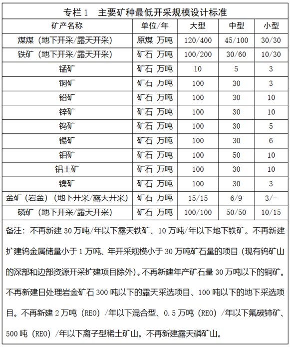 落實全國礦產(chǎn)資源規(guī)劃有關(guān)要求,新建、擴建礦山嚴(yán)格執(zhí)行規(guī)劃確定的礦山最低開采規(guī)模和最低服務(wù)年限。產(chǎn)業(yè)政策準(zhǔn)入要求高于最低開采規(guī)模設(shè)計標(biāo)準(zhǔn)的,以產(chǎn)業(yè)政策為準(zhǔn)。