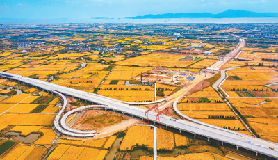 圖為建設(shè)中的浙江省寧波市象山灣疏港高速瞻岐互通工程,如同一條巨龍盤臥在金色的田野上,與碧水青山、河流村莊相互交映,構(gòu)成一幅壯美的交通畫卷。胡學(xué)軍攝(人民視覺)