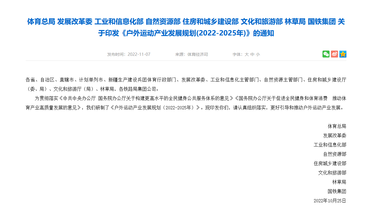 核心提示:據(jù)國家體育總局網(wǎng)站消息,近日,國家體育總局、國家發(fā)展改革委、住房和城鄉(xiāng)建設(shè)部等八部門共同印發(fā)《戶外運(yùn)動(dòng)產(chǎn)業(yè)發(fā)展規(guī)劃(2022