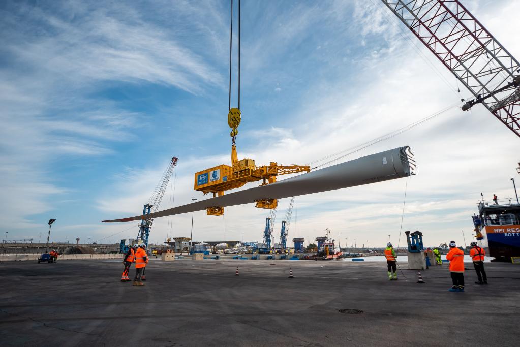 在意大利南部海港塔蘭托,中國和意大利施工人員吊裝風(fēng)電葉片(1月27日攝)。新華社發(fā)(保拉·薩拉帕 攝)