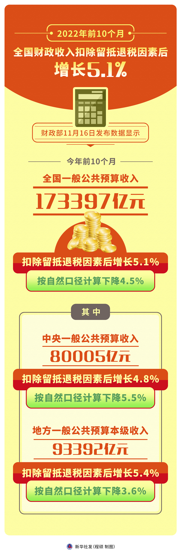 新華社北京11月16日電(記者申鋮)財政部16日發(fā)布數(shù)據(jù)顯示,今年前10個月,全國一般公共預(yù)算收入173397億元,扣除留抵退稅因素后增長5.1%,按自然口徑計算下降4.5%。