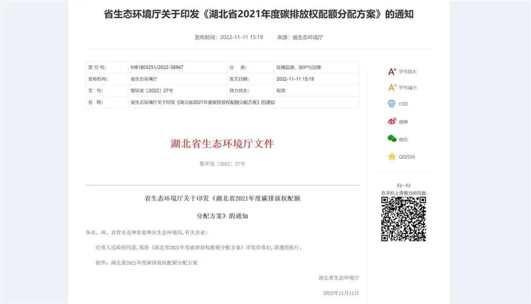 湖北省2021年度納入企業(yè)碳排放配額總量為1.82億噸。