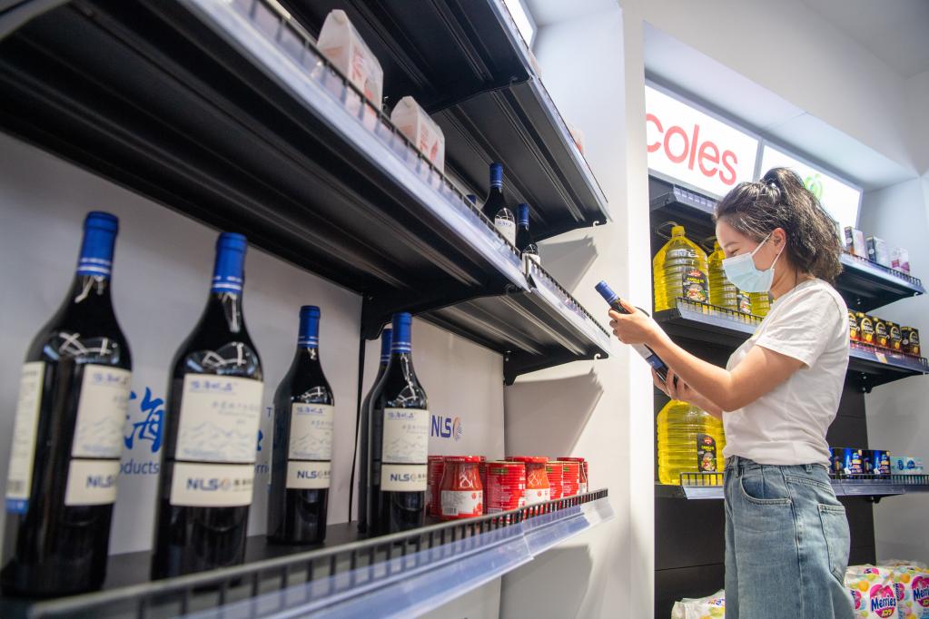 消費者在位于重慶解放碑的“陸海新通道國際消費中心”選購商品。(2022年5月28日攝)。新華社記者唐奕 攝