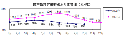 國(guó)產(chǎn)鐵精礦(干基)10月份加權(quán)平均采購(gòu)成本為732.69元/噸,環(huán)比下降3.61元/噸,降幅為0.49%。1-10月累計(jì)平均采購(gòu)成本為845.18元/噸,同比下降304.23元/噸,降幅為26.47%。