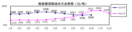 對(duì)標(biāo)企業(yè)煉焦煤10月份加權(quán)平均折算成干基的采購(gòu)成本為2225.52元/噸,環(huán)比升高70.70元/噸,升幅為3.28%。1-10月累計(jì)平均折算成干基的采購(gòu)成本為2395.15元/噸,同比升高660.58元/噸,升幅為38.08%。