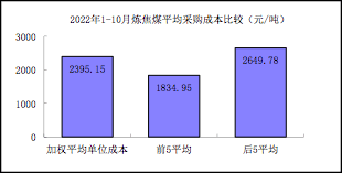 1-10月對(duì)標(biāo)企業(yè)煉焦煤平均采購(gòu)成本最低的前5家企業(yè)折算成干基的加權(quán)平均采購(gòu)成本為1834.95元/噸,比對(duì)標(biāo)企業(yè)平均采購(gòu)成本低560.20元/噸,低于平均采購(gòu)成本23.39%;而采購(gòu)成本最高的5家企業(yè)的加權(quán)平均采購(gòu)成本為2649.78元/噸,比對(duì)標(biāo)企業(yè)平均采購(gòu)成本高254.63元/噸,高于平均采購(gòu)成本10.63%。