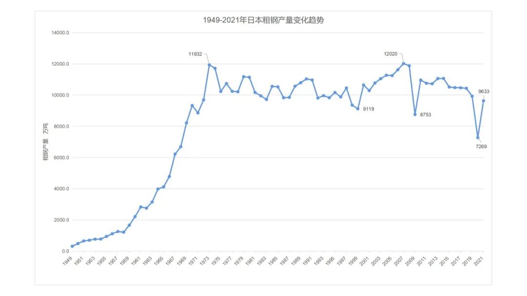 圖2 1949-2021年日本粗鋼產(chǎn)量變化趨勢(shì)