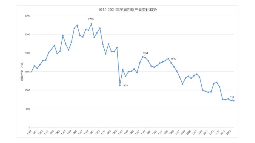 1970年英國粗鋼產(chǎn)量達(dá)到峰值2783萬噸。達(dá)峰后主要受原料供給影響,英國鋼鐵工業(yè)開始減量發(fā)展,到1979年粗鋼產(chǎn)量已減至2146萬噸;20世紀(jì)80年代,通過淘汰落后產(chǎn)能、提高產(chǎn)品附加值、促進(jìn)私有化,英國鋼鐵工業(yè)峰后復(fù)蘇;1989年至今,受國內(nèi)需求下降和全球化競(jìng)爭(zhēng)沖擊,英國鋼鐵工業(yè)持續(xù)減量。
