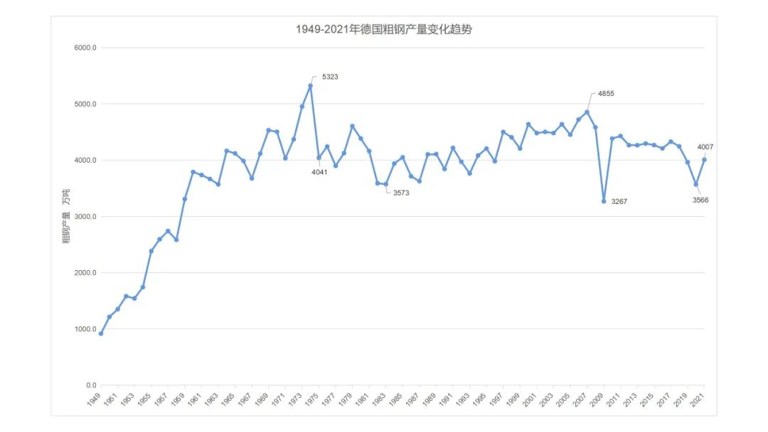 圖3 1949-2021年德國粗鋼產(chǎn)量變化趨勢(shì)