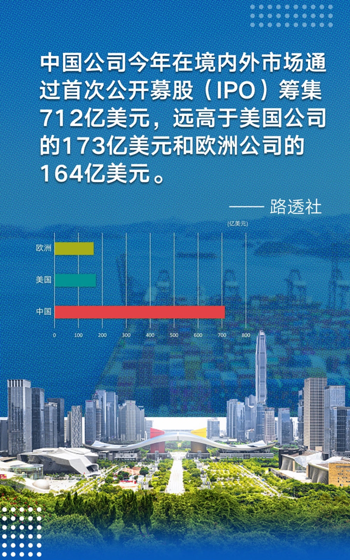 在全球經(jīng)濟增長疲軟的背景下,中國經(jīng)濟的韌性和中國市場的吸引力持續(xù)顯現(xiàn)。路透社近日援引路孚特數(shù)據(jù)說,中國公司今年在境內(nèi)外市場通過首次公開募股(IPO)籌集712億美元,遠(yuǎn)高于美國公司的173億美元和歐洲公司的164億美元。