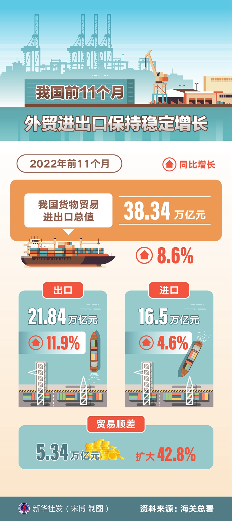 從外貿(mào)主體看,民營企業(yè)進(jìn)出口快速增長。前11個(gè)月,全國有進(jìn)出口實(shí)績的民營企業(yè)49.75萬家,同比增加7.3%,合計(jì)進(jìn)出口19.41萬億元,同比增長13.6%,占同期我國外貿(mào)總值的50.6%,比去年同期提升2.2個(gè)百分點(diǎn),繼續(xù)發(fā)揮外貿(mào)“主力軍”作用。
