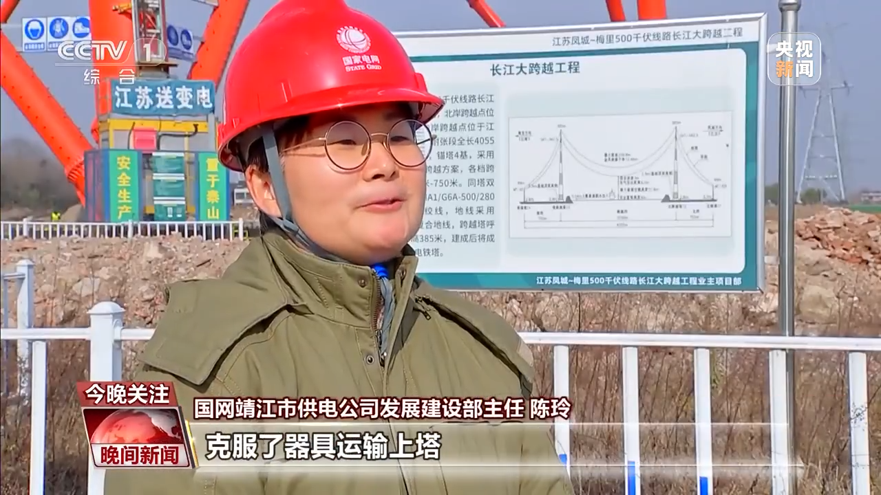 國(guó)網(wǎng)靖江市供電公司發(fā)展建設(shè)部主任 陳玲:(長(zhǎng)江大跨越工程)施工過程中克服了器具運(yùn)輸上塔、跨江2200多米封航放線等難題,創(chuàng)造了桿塔高度、鐵塔根開、抱桿高度和地腳螺栓重量等五個(gè)世界第一。