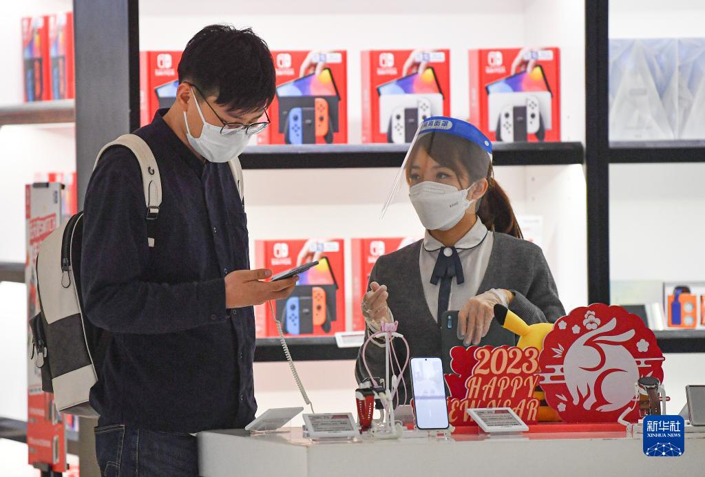 1月19日,消費者在中免集團??谌赵聫V場免稅店選購電子產(chǎn)品。新華社記者 蒲曉旭 攝