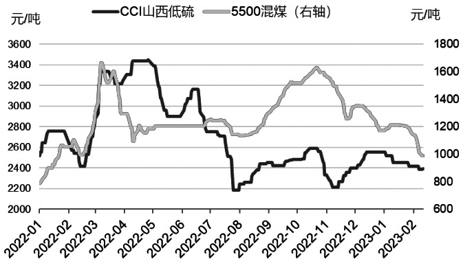 圖為CCI山西低硫焦煤價(jià)格指數(shù)與秦皇島港5500動(dòng)力煤價(jià)格趨勢(shì)