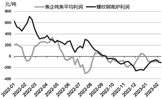 圖為2022年以來焦企利潤及螺紋高爐利潤走勢(shì)