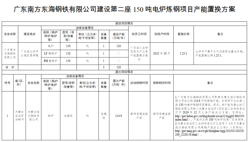 按照《國務(wù)院關(guān)于化解產(chǎn)能嚴重過剩矛盾的指導(dǎo)意見》(國發(fā)〔2013〕41號)、《國務(wù)院關(guān)于鋼鐵行業(yè)化解過剩產(chǎn)能實現(xiàn)脫困發(fā)展的意見》(國發(fā)〔2016〕6號)、《工業(yè)和信息化部關(guān)于印發(fā)鋼鐵行業(yè)產(chǎn)能置換實施辦法的通知》(工信部原〔2021〕46號)的要求,現(xiàn)將廣東南方東海鋼鐵有限公司建設(shè)第二座150噸電爐煉鋼項目產(chǎn)能置換方案予以公告,歡迎社會公眾進行監(jiān)督。