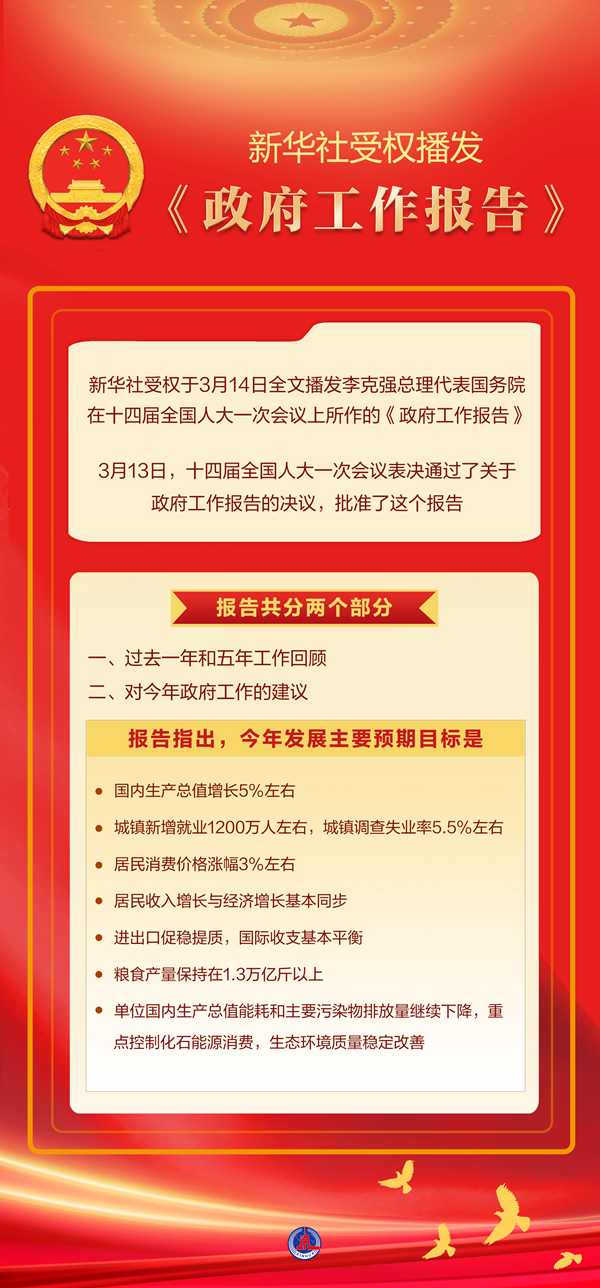 新華社受權(quán)于14日全文播發(fā)李克強(qiáng)總理代表國(guó)務(wù)院在十四屆全國(guó)人大一次會(huì)議上所作的《政府工作報(bào)告》。3月13日,十四屆全國(guó)人大一次會(huì)議表決通過了關(guān)于政府工作報(bào)告的決議,批準(zhǔn)了這個(gè)報(bào)告。