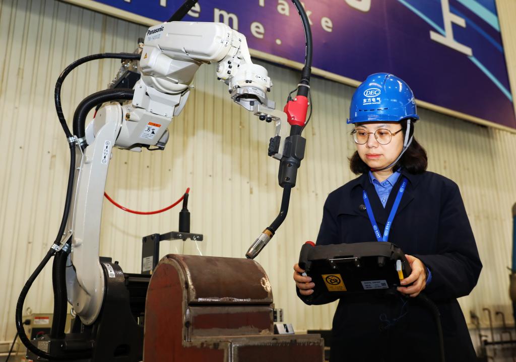 全國人大代表曹天蘭正在進行焊接機器人模擬試驗。賈偉明攝