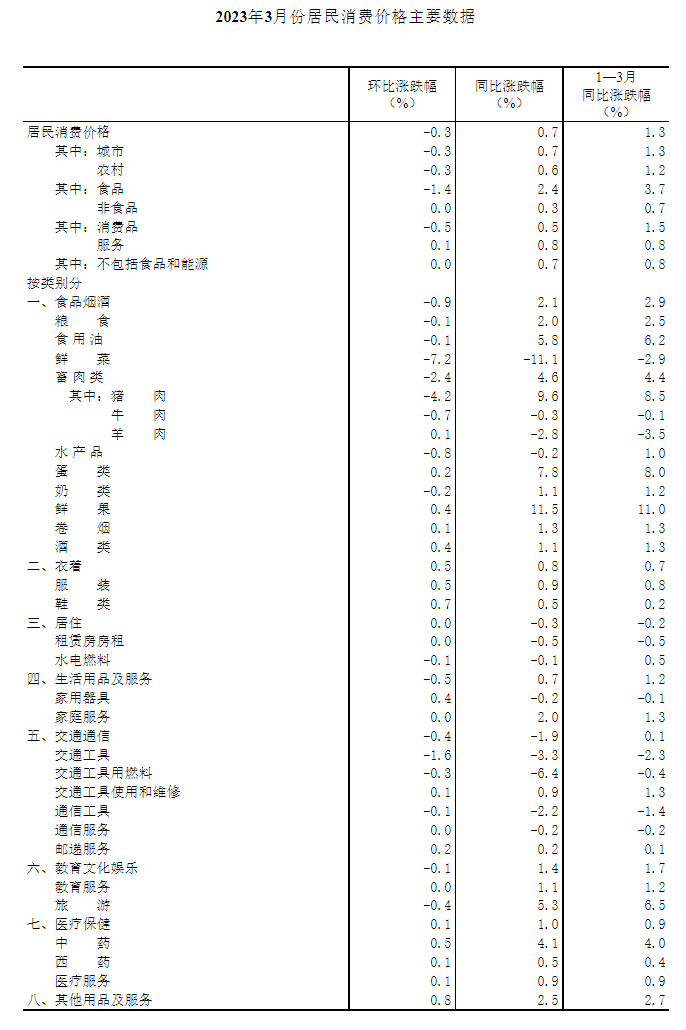 3月份,全國居民消費價格環(huán)比下降0.3%。其中,城市下降0.3%,農(nóng)村下降0.3%;食品價格下降1.4%,非食品價格持平;消費品價格下降0.5%,服務(wù)價格上漲0.1%。